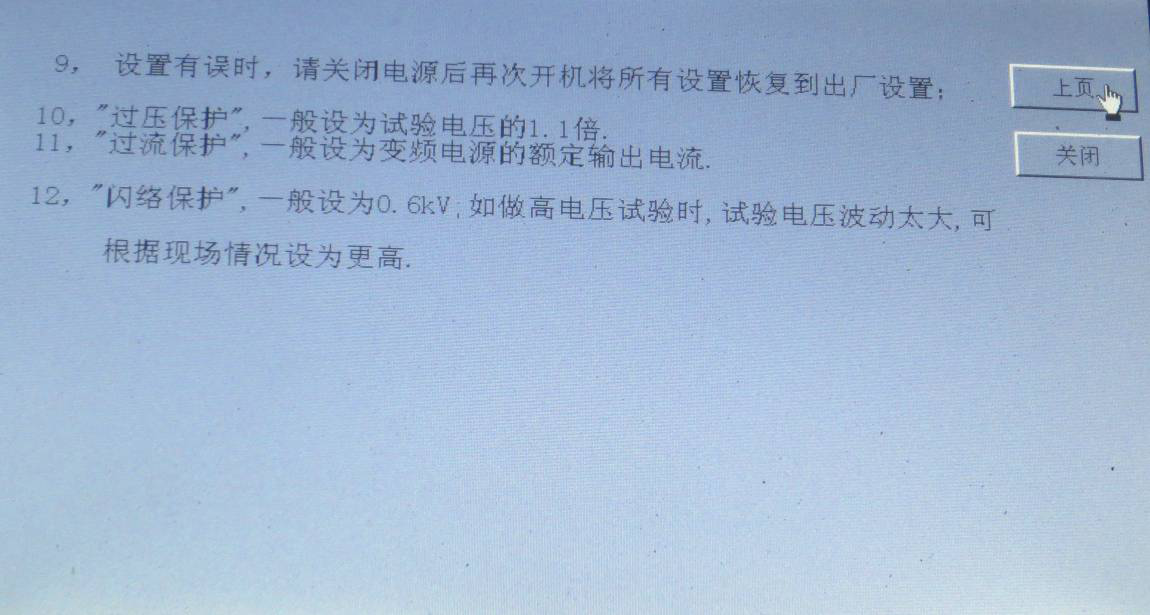 閃絡(luò)保護(hù):設(shè)置擊穿電壓的誤差值,且當(dāng)閃絡(luò)后液晶顯示屏須重新啟動(dòng)