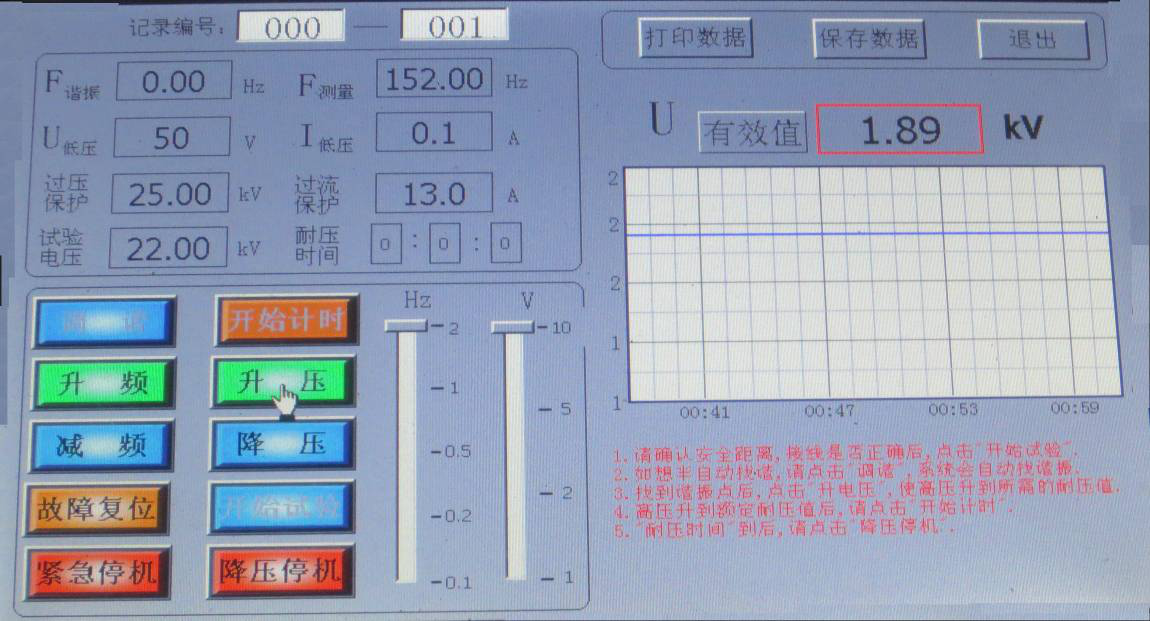 如不想自動(dòng)找諧振點(diǎn),先點(diǎn)擊“升電壓”,將“U低壓”升到50V,再點(diǎn)擊“升頻率”來找諧振點(diǎn),找到諧振點(diǎn)后,點(diǎn)擊“升電壓”, 顯示界面如圖所示。